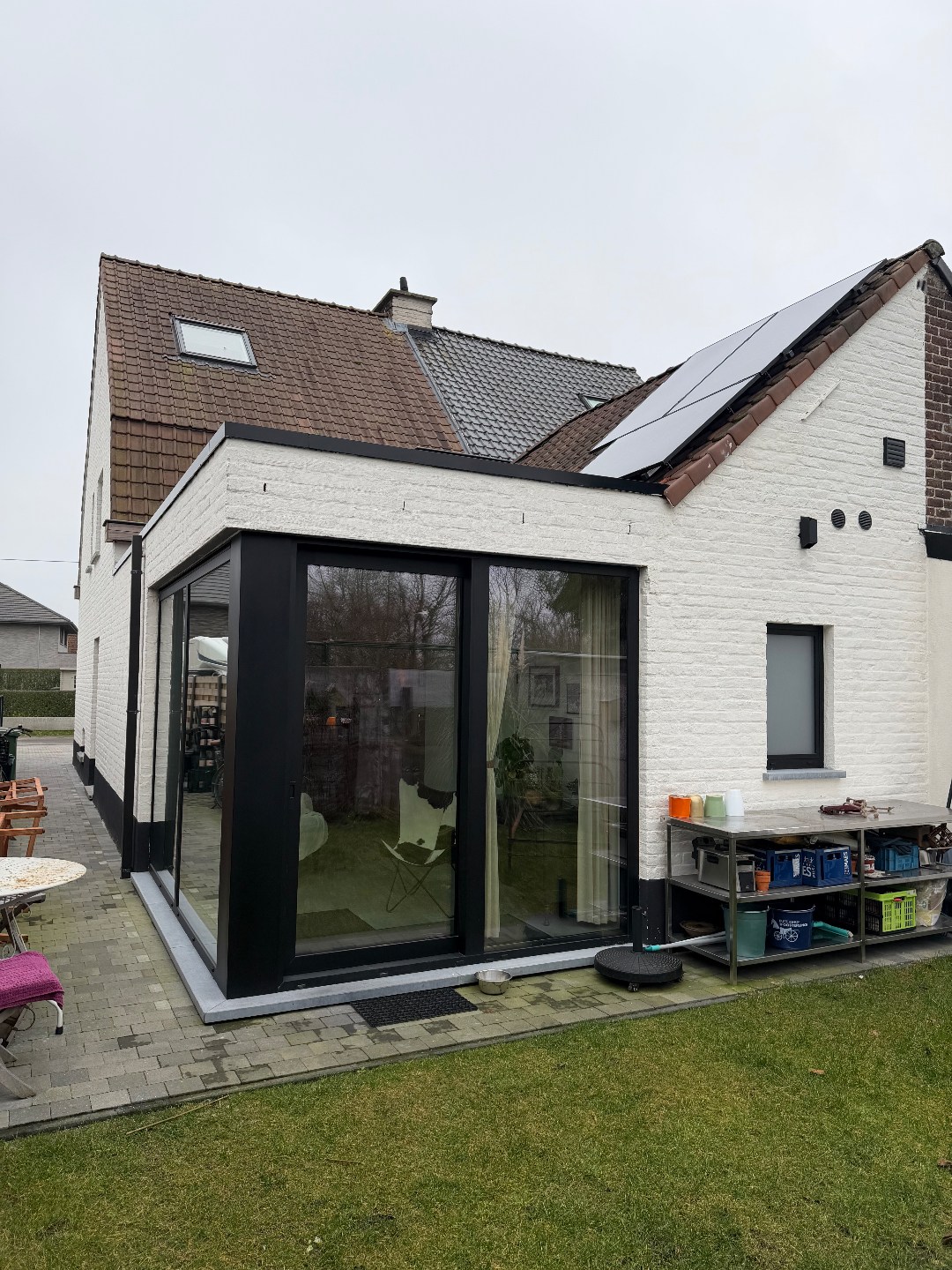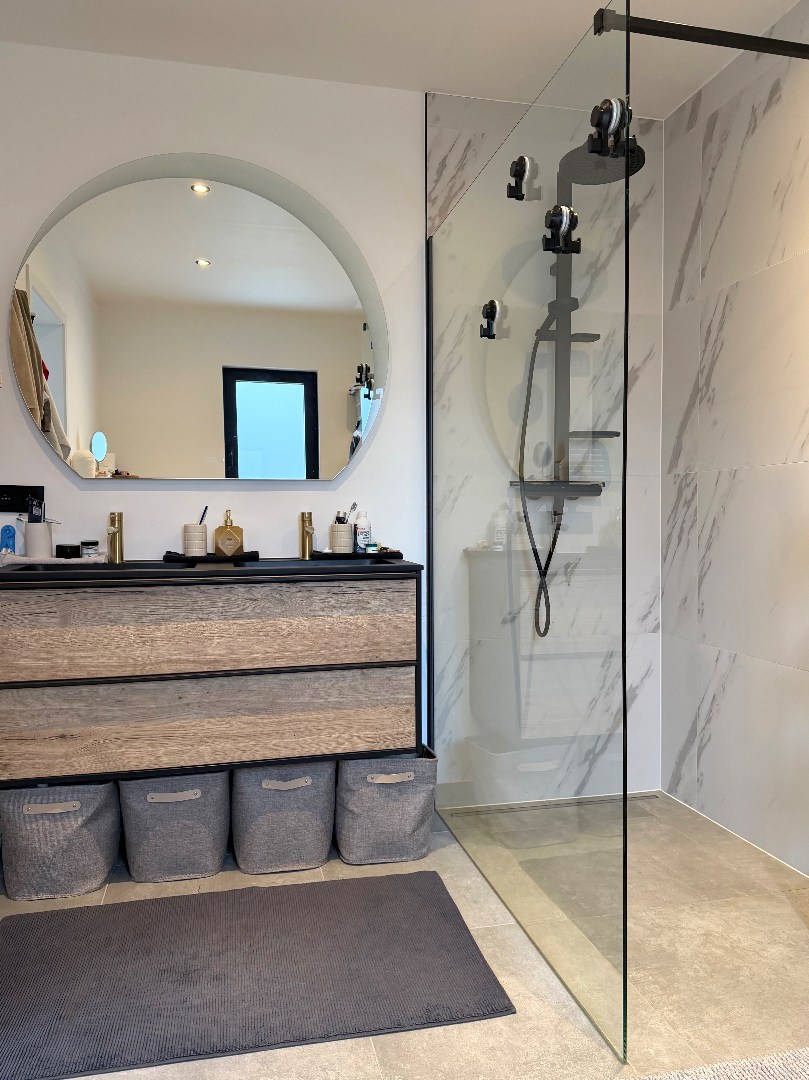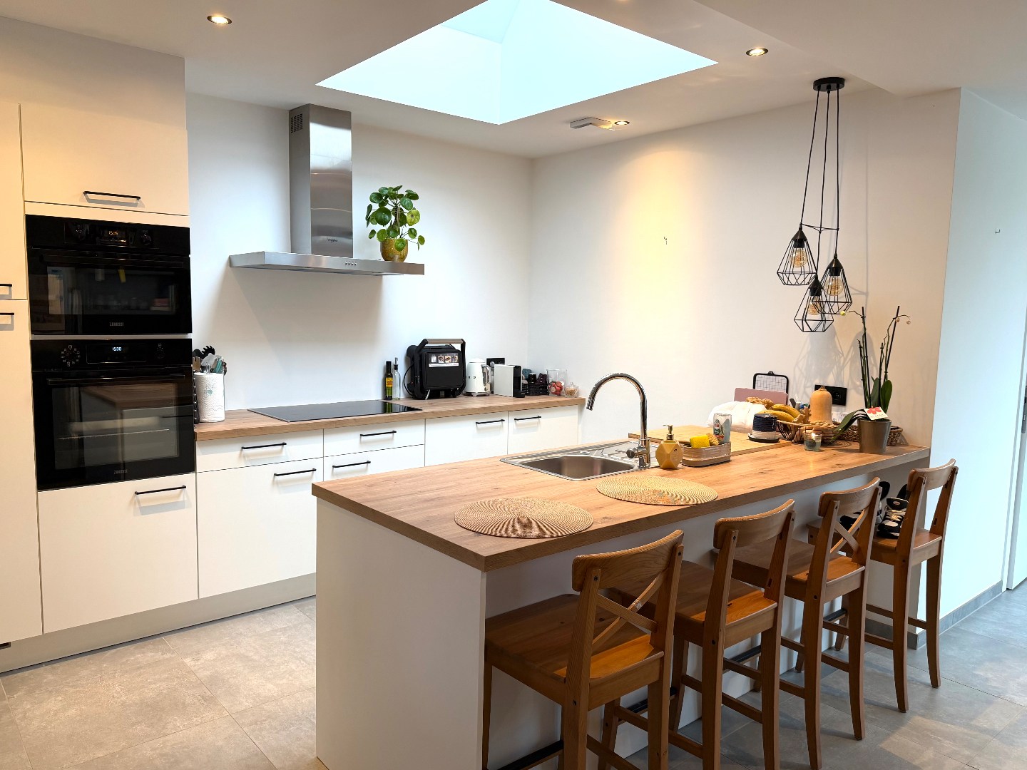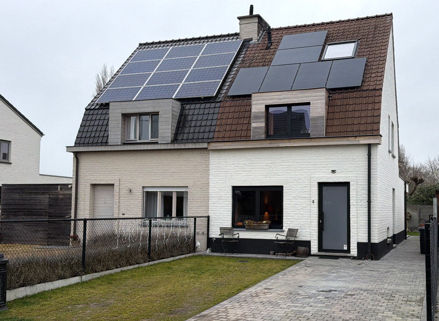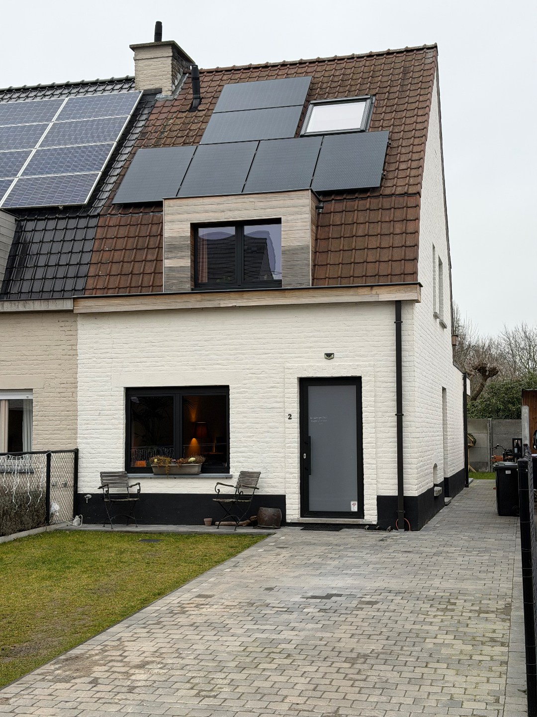 Deze halfopen bebouwing heeft een ideale bereikbaar en is toch rustig gelegen in een doodlopend straatje, net buiten het dorp van Drongen. De woning werd in 2024 volledig gerenoveerd: alle sanitaire leidingen werden vernieuwd, de volledige elektrische installatie, vloeren, ramen, muur- en dakisolatie, keuken en badkamer. Er zijn eveneens zonnepanelen voorzien die zorgen voor een verlaagde energiefactuur. Op het gelijkvloers is er een mooie ruime woonkamer, palend aan de open, praktische keuken die voorzien is van een combi-oven, traditionele oven, vaatwas, koelkast en frigo. De badkamer bevindt zich ook op het gelijkvloers, net als een handige kleine opbergkelder. Op de eerste verdieping zijn er 2 mooie slaapkamers en een ruimte die als dressing of als bureau kan dienen, met trap naar de 3de grote slaapkamer onder het dak. Er is ook een apart toilet op de nachthal aanwezig. Onder het dak bevindt zich ook de technische berging met de brander en de omvormer van de zonnepanelen (vermogen van 3870WP!)