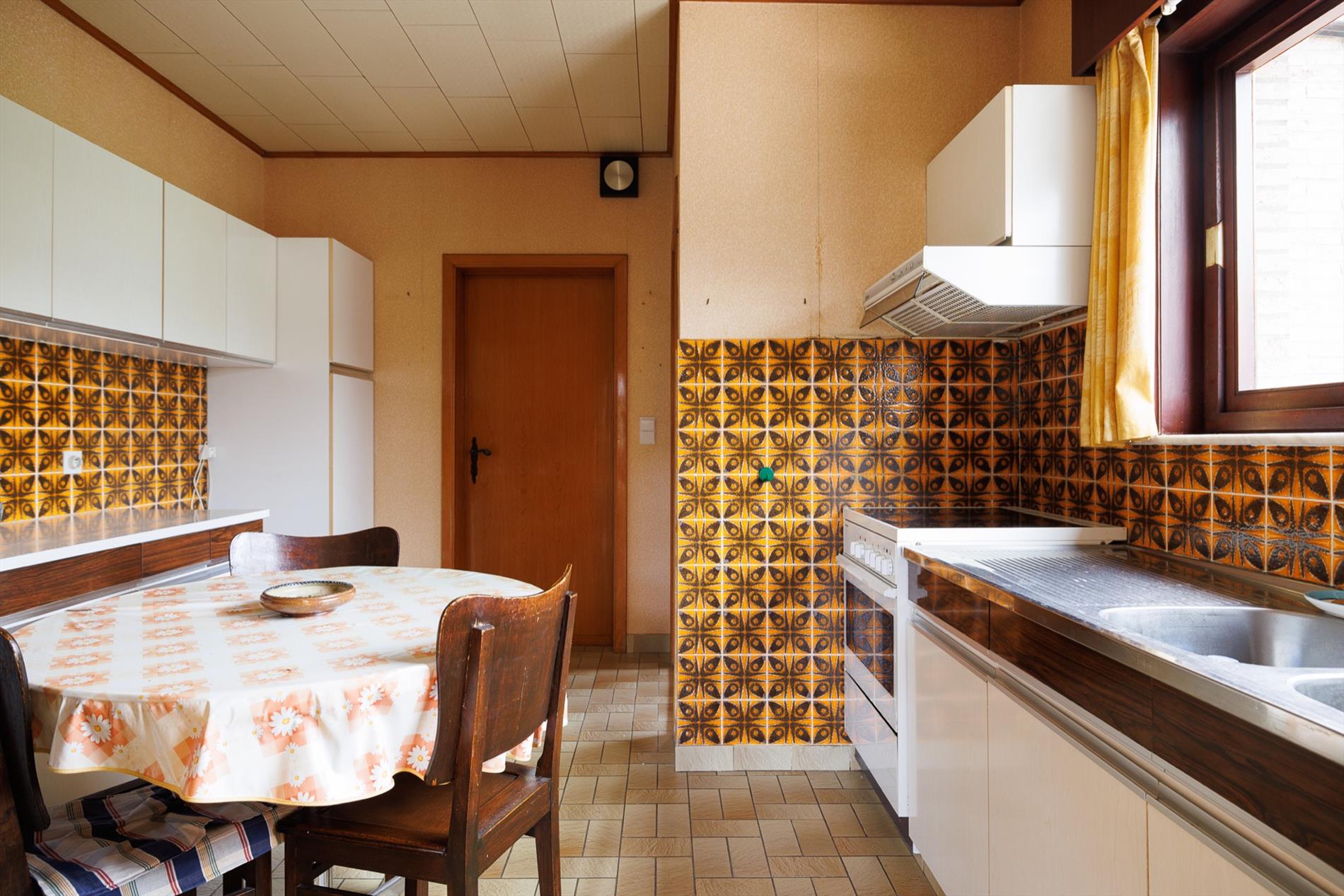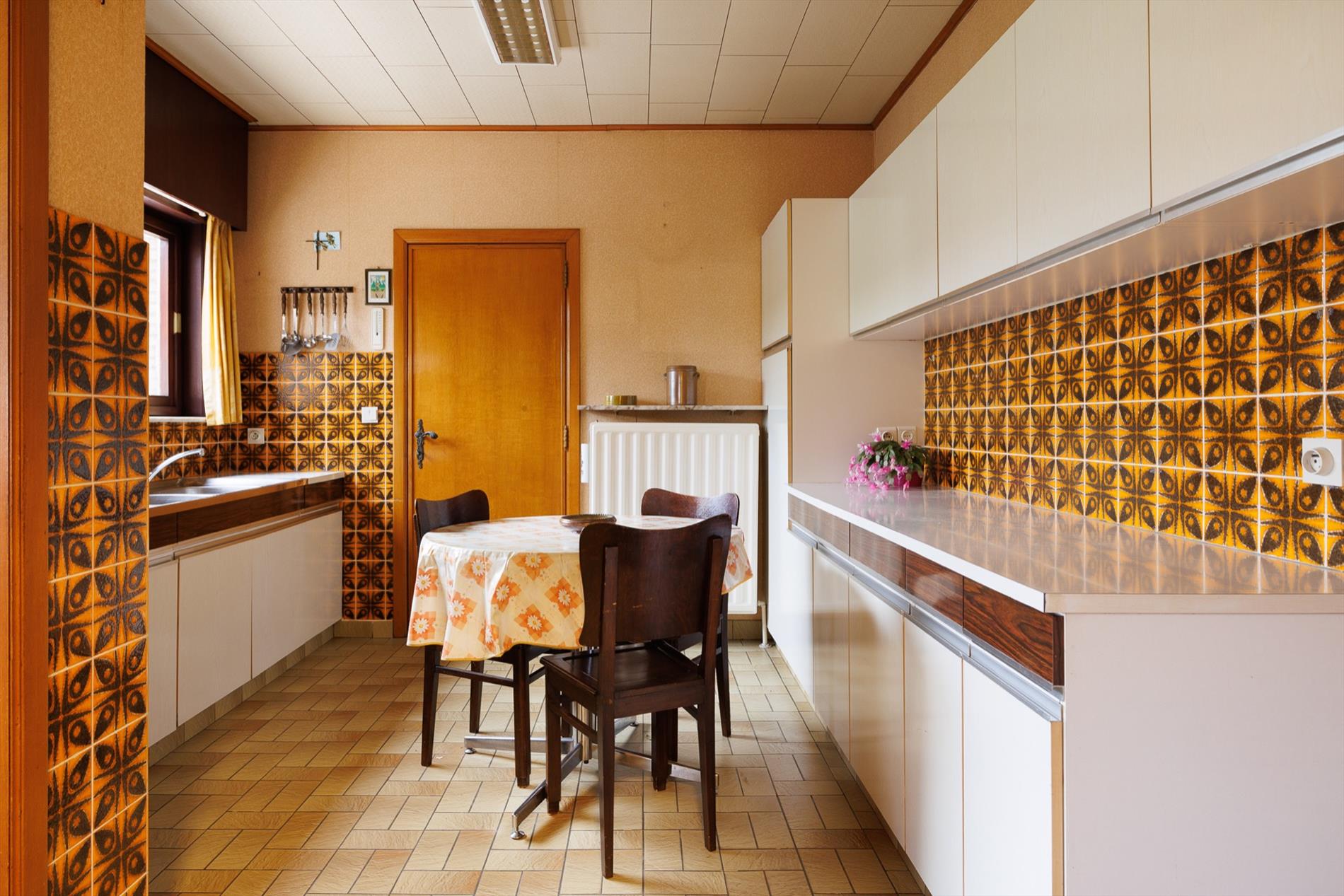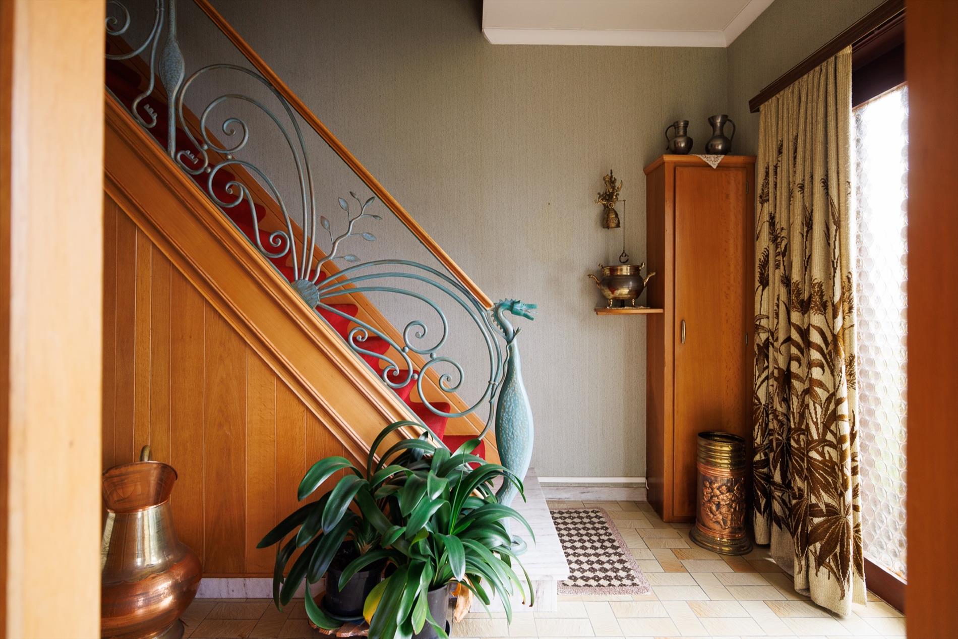 Deze woning bevindt zich in een rustige doodlopende straat in de residentiële buurt tussen de Gentbrugge Meersen en de Brusselsesteenweg. De nabijheid van invalswegen, openbaar vervoer, alle voorzieningen én openbaar groen zijn zeker een pluspunt! De woning bevindt zich in een oudere verkaveling van 1963, met een brede straat en mooie groenschermen. De woning zelf werd gebouwd in 1973 en heeft een heel goede bouwstructuur. Het interieur heeft tal van authentieke elementen uit de jaren '70 maar tegelijk ook een hedendaagse indeling. Er is een ruime inkomhal met een sierlijke koperen trapleuning als 'eyecatcher', een grote woonkamer met veel lichtinval, een houtkachel in de zithoek en een eetplaats, een aparte keuken met toegang naar een badkamer en naar de achter inkom, waar zich eveneens een apart toilet en de technische berging bevinden. Een veranda werd later aangebouwd. Boven is er een ruimtelijke nachthal met toegang naar 3 grote slaapkamers en een kleinere kamer die perfect kan dienen als badkamerruimte óf plaats voor een vaste trap naar de grote open zolder. Het dakgebinte is in perfecte staat en de ruimte kan zeker dienen voor 2 extra kamers. De tuin naast de woning heeft een westelijke oriëntatie, de tuin achteraan is oostelijk gericht. Er is tevens een grote aparte garage met sectionaalpoort. Deze ruime woning biedt heel wat potentieel op een uiterst goede locatie! meer info: 0485/321.842